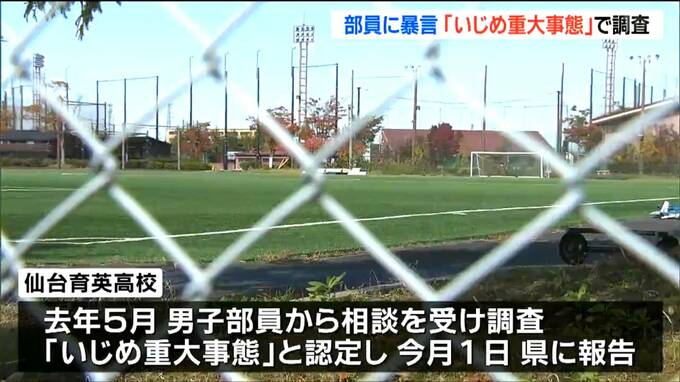 仙台育英学園高校によりますと、被害を訴えたのはサッカー部の3年生の男子部員です。男子部員は、1年生の頃から主に同級生の複数の部員から暴言を繰り返し浴びせられていたということです。学校は去年5月、男子部員から相談を受け、調査を続けていましたが「いじめ重大事態」と認定し11月1日、宮城県に報告しました。