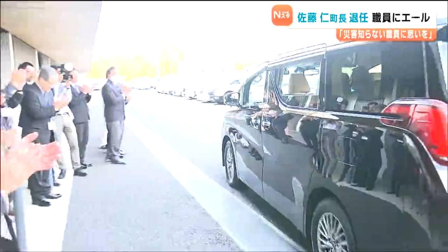 大きな拍手とともに送り出された佐藤町長。慣れ親しんだ庁舎に別れを告げました。