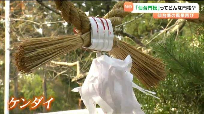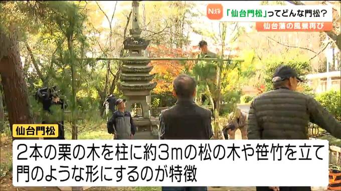 東日本大震災後に新たな資料が見つかったことを機に復元された「仙台門松」は、2本の栗の木を柱に約3メートルの松の木や笹竹を立て、門のような形にするのが特徴です。