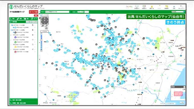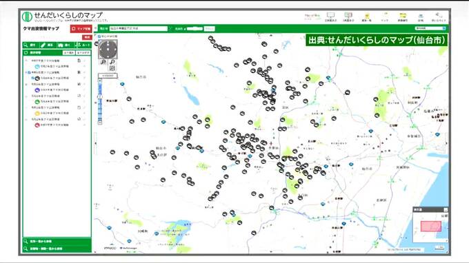 仙台市ではクマの出没情報が寄せられた場所をホームページ上で見られるようにしています。