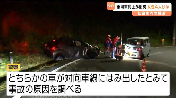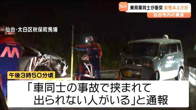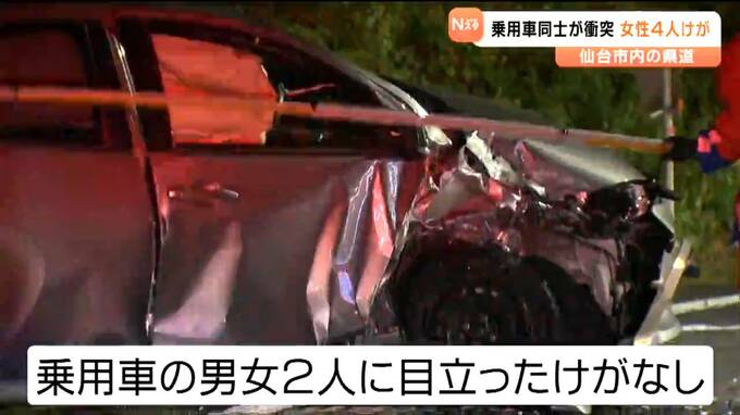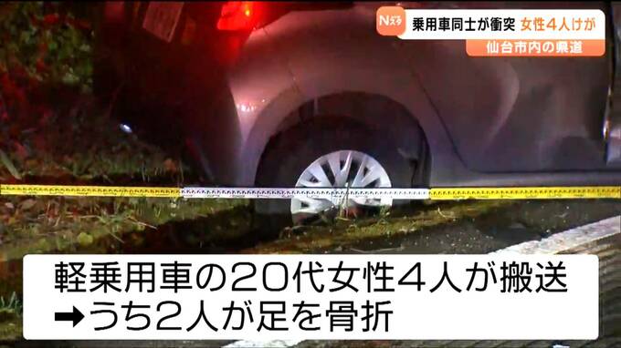 警察などによりますと、乗用車と軽乗用車が正面衝突し、軽乗用車に乗っていた20代の女性4人が病院に運ばれ、このうち2人が足の骨を折る大けがをしました。