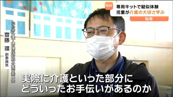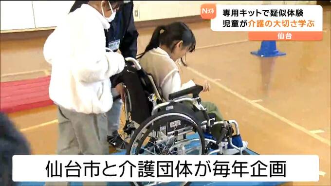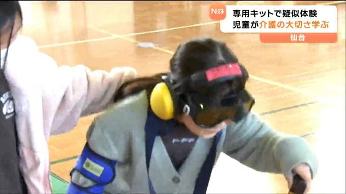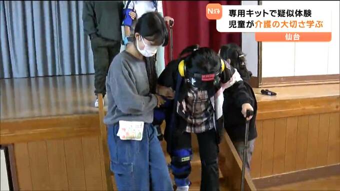 介護や福祉について学ぶ出前授業が仙台の小学校で行われ児童たちが、専用のキットを使い高齢者のサポートを体験しました。