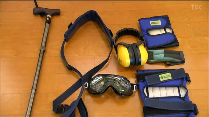 視界が狭くなるゴーグルや重りがついたバンドなど要介護者の生活を疑似体験できるキットです。