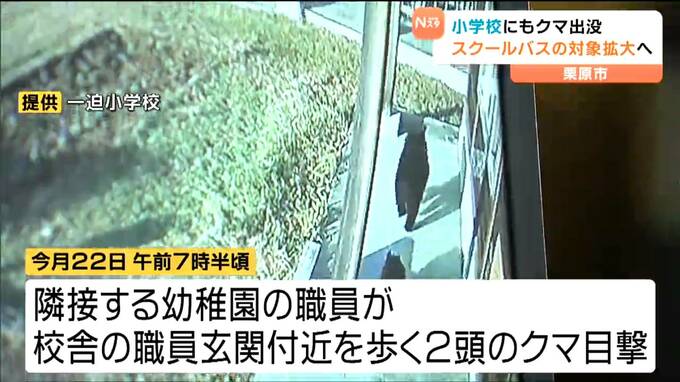 学校によりますと、11月22日午前7時半ごろ隣接する幼稚園の職員が校舎の職員玄関付近を歩く2頭のクマを目撃しました。