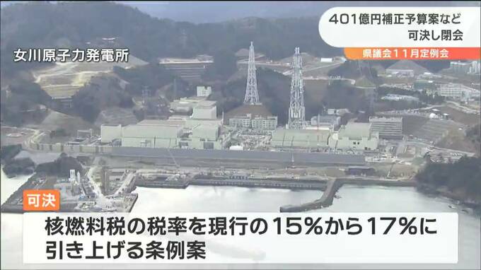 宮城県議会11月定例会は、物価高騰対策を中心とした401億円あまりの補正予算案や核燃料税の税率を引き上げる条例案などを可決し14日、閉会しました。