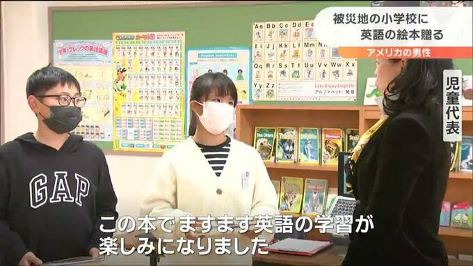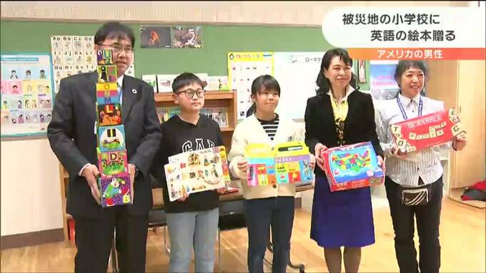 東日本大震災の被災地の子どもたちを支援したいと、アメリカの図書館で働く男性から届いた英語の絵本が14日、宮城県東松島市の小学校に贈られました。