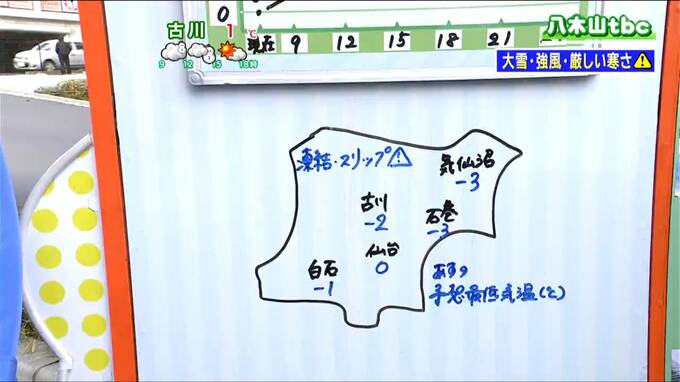 13日の朝の最低気温は広い範囲で氷点下となり、特に石巻や気仙沼周辺では冷え込みが強まる予想です。路面の凍結によるスリップに注意してください。