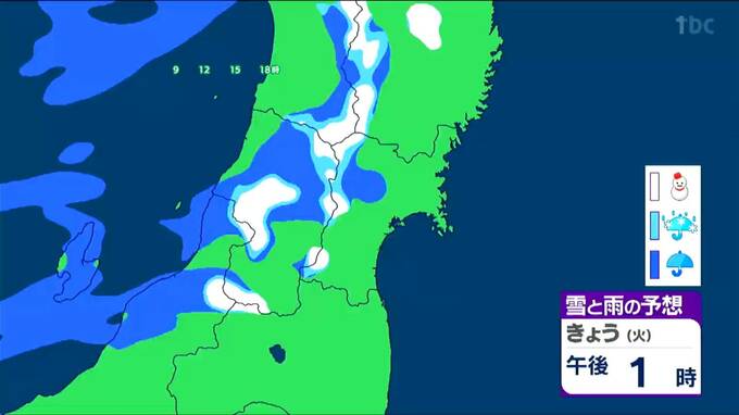 西部では日中、断続的に雨が降ります。夜は寒気が強まってくるため、峠道では雪に変わり明日の朝にかけて数cm程度積もるところがある見込みです。