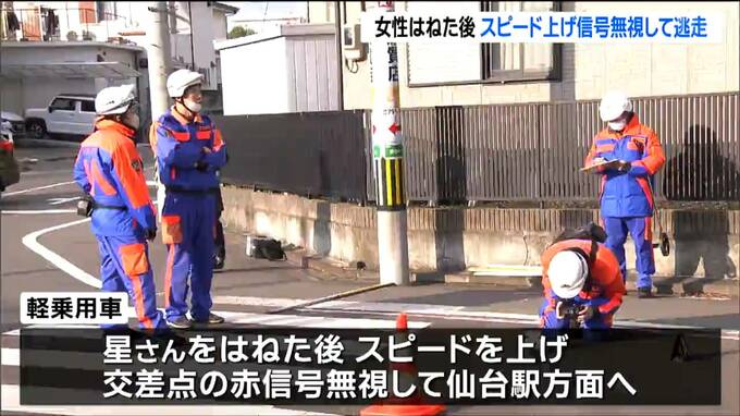 12月17日、仙台市内で女性が軽乗用車にはねられ重体となっているひき逃げ事件で車は女性をはねた後、スピードをあげたうえ、交差点の赤信号を無視して逃走していたことが、警察への取材で分かりました。