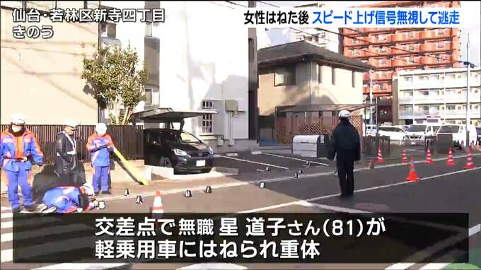 この事件は、12月17日午前6時35分頃、仙台市若林区新寺4丁目の交差点で近くに住む無職の星 道子さん(81)が軽乗用車にはねられ意識不明の重体となっているものです。
