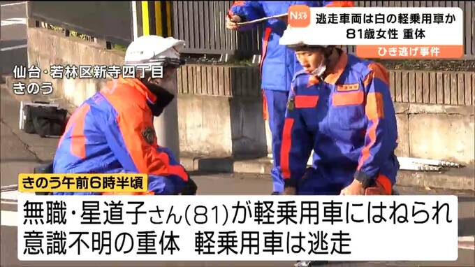 この事件は、12月17日午前6時半分頃、仙台市若林区新寺4丁目の交差点で近くに住む無職の星 道子さん(81)が軽乗用車にはねられ意識不明の重体となっているもので軽乗用車はその場から逃走しています。