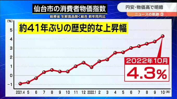 総務省によりますと、モノやサービスの値動きをみる仙台市の消費者物価指数がもっとも上がったのは10月。全ての品目で▼4.3%、1981年以来、41年ぶりの上昇率となりました。