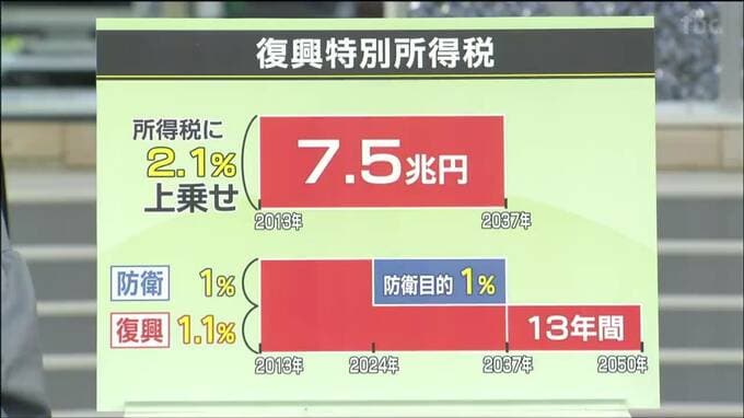 「復興特別所得税」とは、2013年から2037年までの25年間、所得税に2.1%上乗せされ、7.5兆円が確保されることになっています。