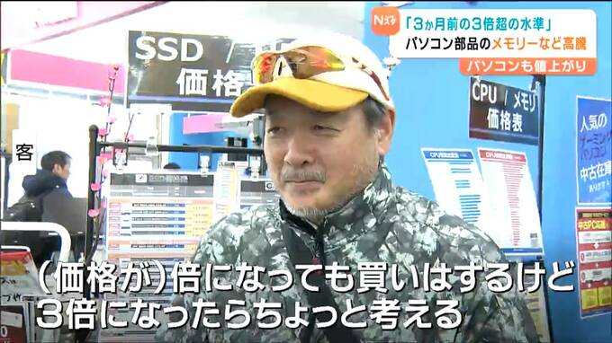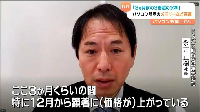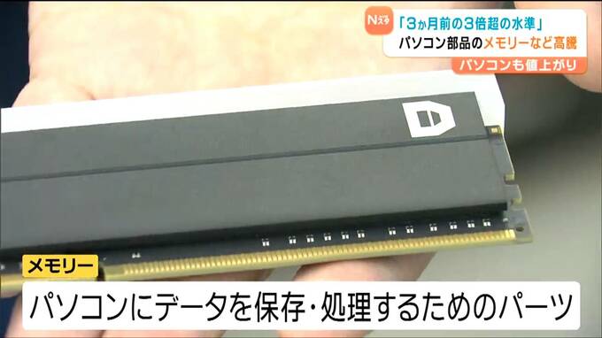 皆さんが使っているパソコンに関するニュースです。パソコンに内蔵されるメモリーなどといった部品の値上がりが続いています。