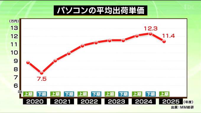 また、春の入学シーズンなどでパソコンが品薄になる可能性があるため注意してほしいと話しています。ICT分野の市場調査コンサルティング会社「MM総研」によりますと、国内のパソコンの平均出荷単価は2021年度以降、上昇を続けています。2025年度の下期は12万3000円と過去5年で最も高くなりました。