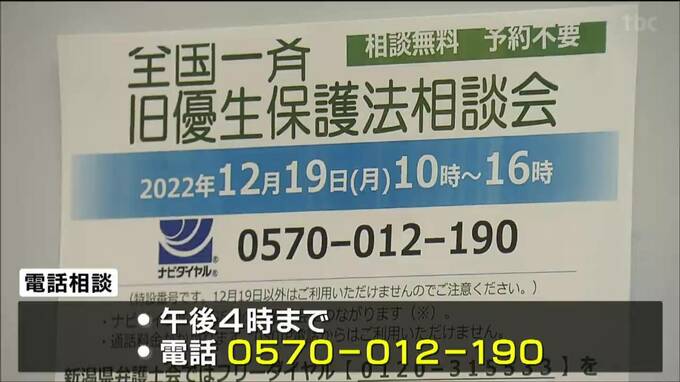 今回の電話相談は埋もれている被害を掘り起こそうと、被害者や親族に加え、支援に携わる福祉関係者や医療関係者も対象にしています。弁護団によりますと、旧優生保護法による不妊手術は全国で2万5000件にのぼるとされていますが、今年10月末現在で救済法に基づく一時金を申請し認定されたのは全国で1000人ほどにとどまっています。相談は午後4時までで、電話0570ー012ー190で受け付けています。