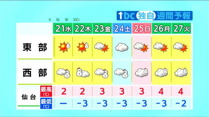 今回の冬将軍は、これまでと異なり体力がありそうです。週間予報を見ると、最高気温が5℃以上となる日は今のところない予想で、西部を中心に雪が降る見込みです。連日、気温が平年より低い状態が続くことになります。