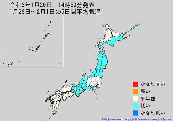 26日(月)~27日(火)は冬型の気圧配置が緩みそうですが、気象庁発表の週間予報解説資料によると、27⽇(火)は、本州南岸をいわゆる南岸低気圧が進み、東・⻄⽇本太平洋側で雪や⾬となる可能性もあるとしています。また、気象庁20日午後2時半発表の2週間気温予報では、28日(水)からの5日間も気温が平年より低いと予想される地域が多くなっています。