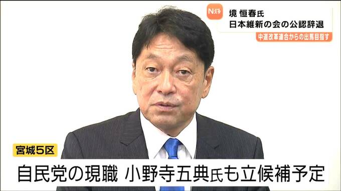 宮城5区では、日本維新の会から衆議院選挙への立候補を予定していた境恒春氏が、党の公認を辞退したことがわかりました。今後は中道改革連合からの出馬を目指すということです。