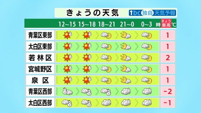 【22日宮城の天気】強い寒気で日中も厳しい寒さ 路面凍結に注意 西部は断続的に雪降る tbc気象台 2026年1月22日(木) 11:45 国内 宮城県内各地の予報 仙台市内 各地の最高気温は以下の通りです。 ■青葉区東部:1℃ ■青葉区西部:-2℃ ■若林区:2℃ ■太白区東部:1℃ ■太白区西部:-1℃ ■宮城野区:1℃ ■泉区:1℃