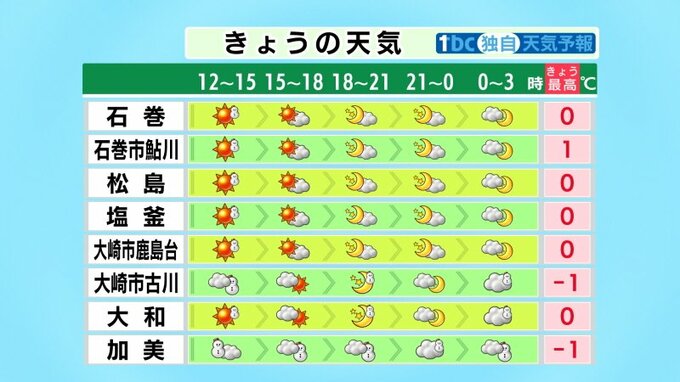 ■石巻:0℃ ■石巻市鮎川:1℃ ■松島:0℃