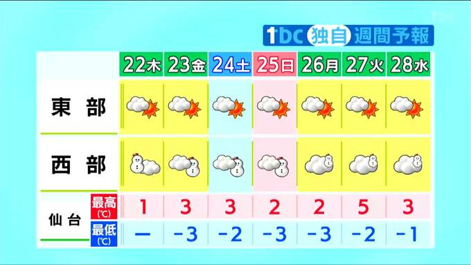 強い寒気の影響はまだまだ続きます。27日火曜日は仙台の最高気温が5℃くらいまで上がる可能性がありますが、これでも平年並みか平年よりも若干低いくらいです。