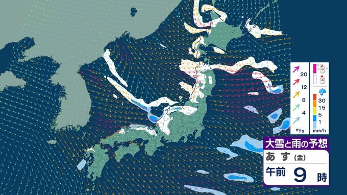 そしてこの後も25日(日)頃にかけて強い冬型の気圧配置が続き、上空の寒気も多少の強弱を繰り返しながら居座る見込みです。日本海には風のぶつかり合いに伴う活発な雪雲の帯=JPCZ(日本海寒帯気団収束帯)が、23日(金)にかけて北陸西部から北陸東部へと移動する見込みで、こうした所は短時間に雪が強まるおそれがあります。