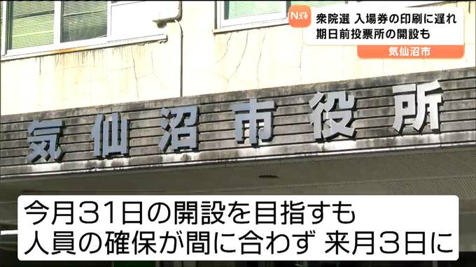 衆院選の事務作業に遅れ 投票所の入場券印刷間に合わず 全有権者に届くのは投票日2日前にずれ込む見通し 宮城・気仙沼市 2026年1月22日(木) 18:48 国内 衆院選の事務作業に遅れが出ています。宮城県気仙沼市では、投票所の入場券の印刷が間に合わず、すべての有権者に届くのが投票日2日前にずれ込む見通しとなりました。気仙沼市選挙管理委員会によりますと、入場券…
