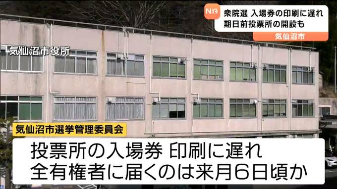 気仙沼市選挙管理委員会によりますと、入場券は通常、公示日に合わせて届きますが今回は印刷が間に合わず、すべての有権者のもとに届くのが投票日2日前の2月6日頃にずれ込む見通しだということです。また、期日前投票所6か所のうち、総合支所やイオンなどの合わせて4か所は、1月31日の開設を目指していましたが、人員の確保が間に合わず、2月3日にずれこむということです。