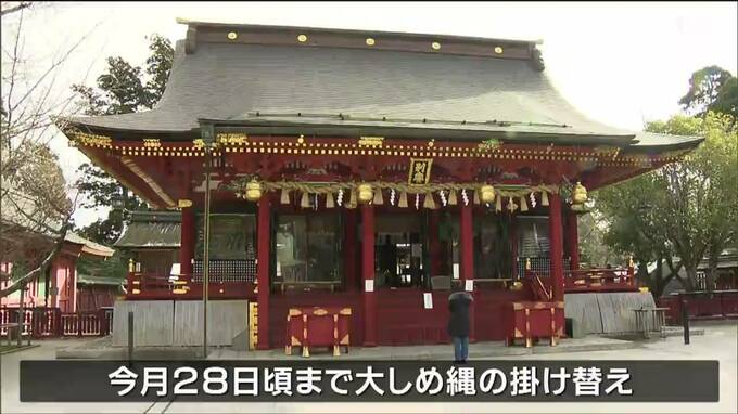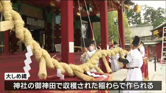 烏帽子に白装束の神社の職員5人が長さ8メートル、重さ60キロの大しめ縄を運び拝殿に取り付けていきました。拝殿や鳥居に取り付けられるこの大しめ縄は、神社の御神田で収穫された稲わらで作られたもので、塩釜神社では毎年この時期に掛け替えを行っています。