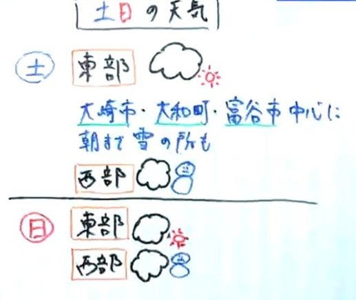 24日は、東部は基本的に曇り時々晴れとなりますが、大崎市や大和町の東部、富谷市を中心に雪雲が流れ込んでくる可能性があります。大崎市や大和町の辺りでは、場合によっては4〜5cm程度新たに雪が積もるかもしれません。西部は断続的に雪が降る見込みです。