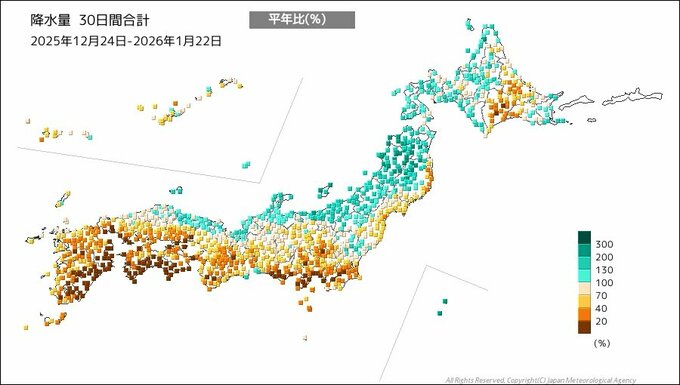 東海、近畿太平洋側、四国、九州南部では、2025年12月末からの4週間の地域平均降水量が、過去の同期間と比べて30年に一度程度の顕著な少雨となっているとしています。向こう一週間も冬型の気圧配置となる日が多い見込みで、東京・名古屋・大阪といった地域では週間予報に雨や雪のマークがなく、空気がカラカラに乾いた状態が続くものとみられます。「最長寒波」の影響で暖房器具を使う機会も多いとみられますが、火の取り扱いには十分注意してください。