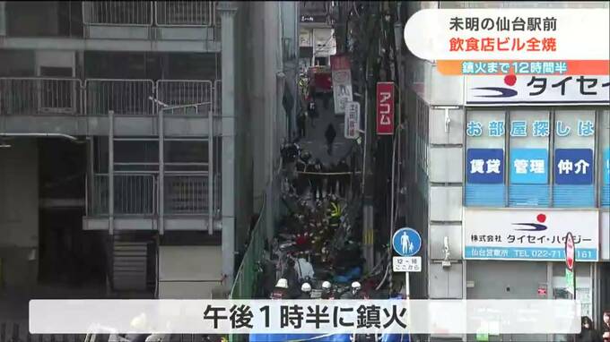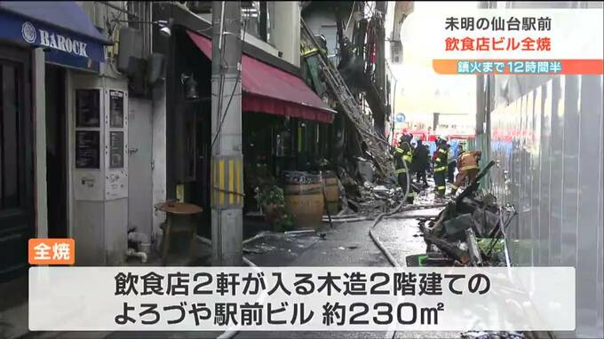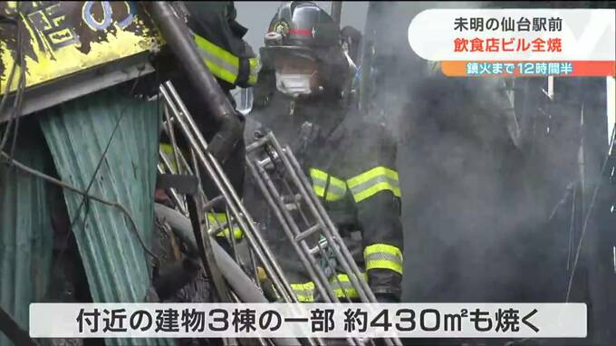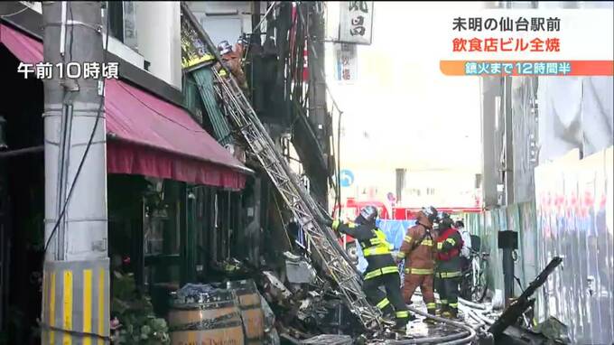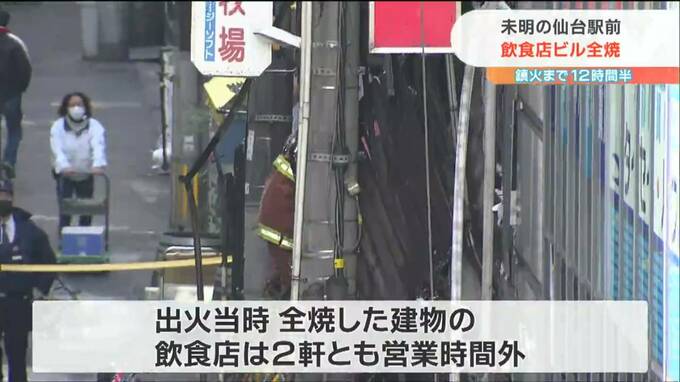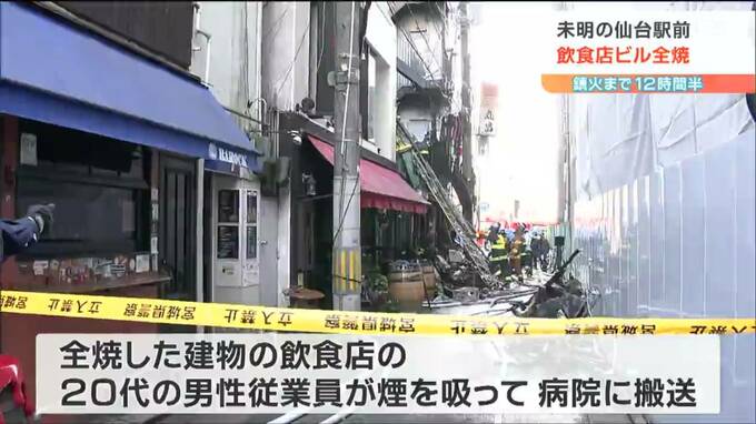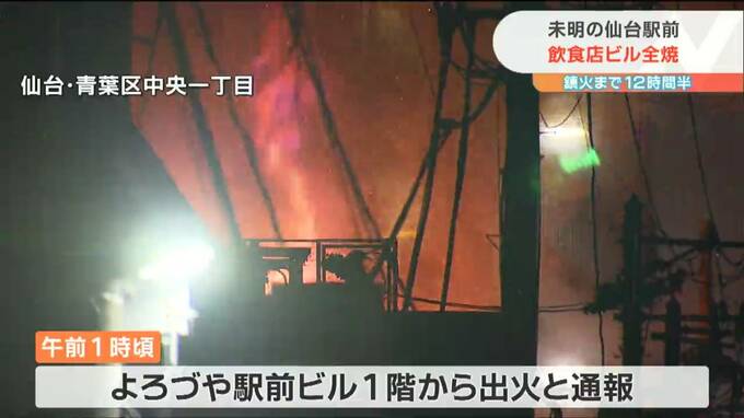 未明の仙台市中心部が騒然としました。20日未明、JR仙台駅前の飲食店が多く立ち並ぶ場所で火事があり、飲食店が入る建物1棟が全焼しました。消し止められたのは12時間半後でした。