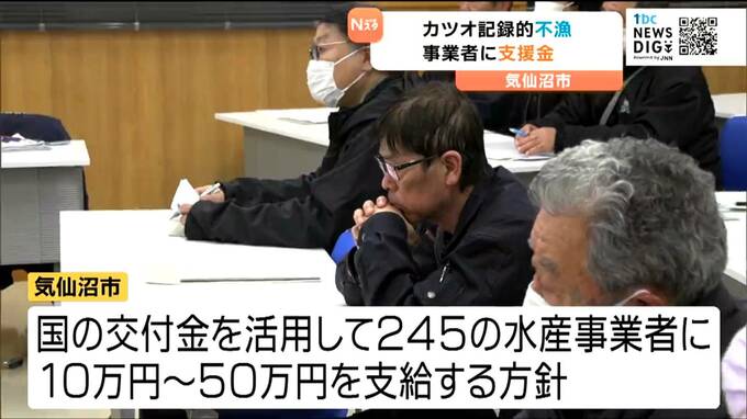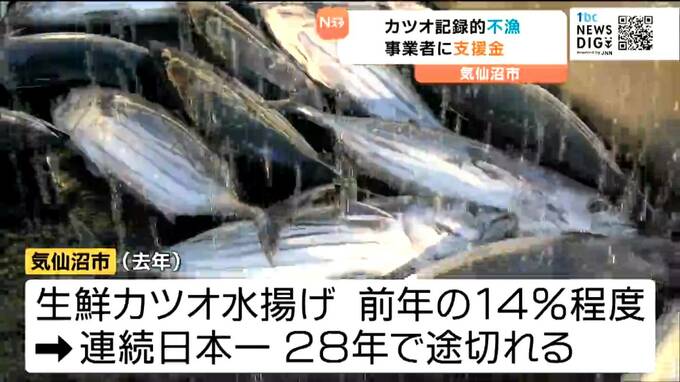 生鮮カツオが記録的な不漁となったことを受け気仙沼市は水産事業者に支援金を支給することを決めました。