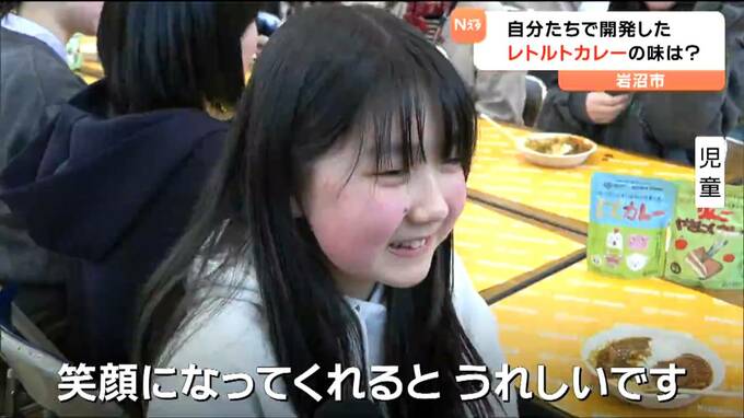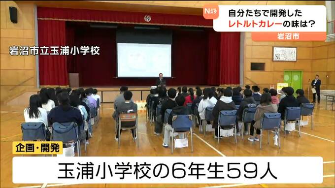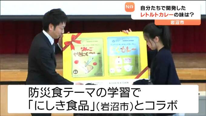 こちらが開発したレトルトカレー、「りんごやきにくカレー」と「にくカレー」の2種類です。企画と開発に携わったのは、宮城県岩沼市立玉浦小学校の6年生59人で、児童の代表に商品が手渡されました。児童たちは、「防災食」をテーマにした学習の中で地元の「にしき食品」とコラボし、食材やパッケージのデザインについて話し合ってきました。
