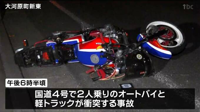 2人乗りオートバイと軽トラックの事故 オートバイの男性2人が出血伴うけが 宮城・大河原町 2026年2月15日(日) 20:54 国内 2月15日午後6時半頃、大河原町新東の国道4号で2人乗りのオートバイと軽トラックが衝突する事故がありました。この事故でオートバイに乗っていた男性2人が出血を伴うけがをして町内と仙台市内の病院に運ばれたとい…