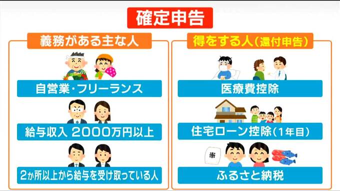 まず確定申告の“義務がある”主な人は、自営業・フリーランスなど個人事業主・会社員や公務員のうち給与収入が2000万円以上の人・2か所以上から給与を受け取っている人。