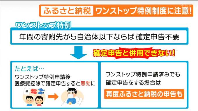 ただし、このワンストップ、確定申告と併用はできません。例えば、ワンストップ特例の申請をした後に医療費控除を受けるため、確定申告をした場合、ワンストップの申請は全て無効となってしまいます。