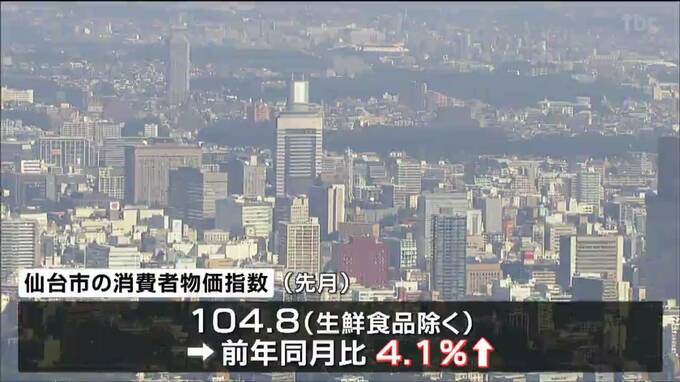 家庭で消費するモノやサービスの値動きをみる11月の仙台市の消費者物価指数は、生鮮食品を除いた指数が去年より▼4.1%上昇しました。4%を超える上昇率は2か月連続です。