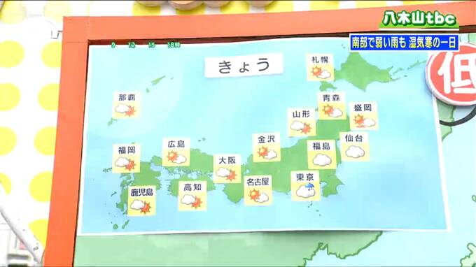 最高気温は7℃前後とほぼ平年並みですが、日差しがほとんどなく、体感的には冷たさを感じる「湿気寒」の天気です。県南部を中心に弱い雨が降るところもあり、折りたたみ傘の携帯をおすすめします。