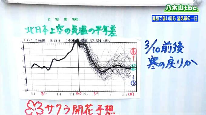 3月7日から14日にかけての週は平年よりもやや低めの予想となっており、3月10日前後に寒の戻りがありそうです。