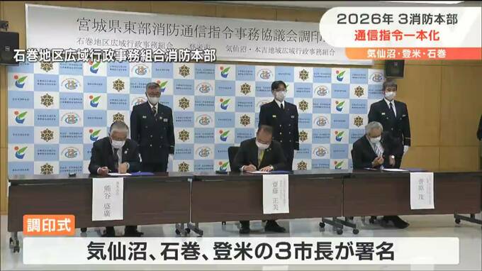 石巻広域消防本部で行われた協議書の調印式では気仙沼、石巻、登米の3市長が署名を取り交わしました。