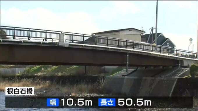 新しい根白石橋は、幅は10.5㍍、長さは50.5㍍あります。