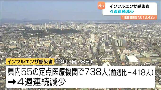 宮城県によりますと、3月2日から8日までの1週間に県内55の定点医療機関でインフルエンザと診断された人の数は738人と、前の週に比べて418人減りました。