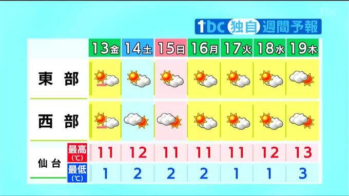 最低気温は12日朝とあまり変わらず、霜に対する農作物の管理に注意してください。最高気温は12日と同じくらいまで上がり、3月下旬並みの所が多いでしょう。