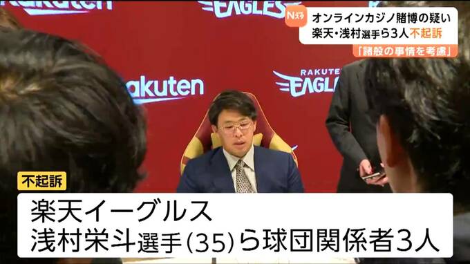 仙台地方検察庁は18日、オンラインカジノで賭博をした疑いで書類送検されていたプロ野球・楽天イーグルスの浅村栄斗選手ら球団関係者3人について不起訴処分としました。
