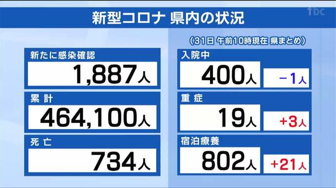 31日午前10時現在の県のまとめでは入院中が400人、このうち19人が重症、宿泊療養中が802人です。