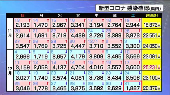 1日ごとの感染者数の推移です。31日は先週土曜日よりも1619人少なく5日連続で前の週の同じ曜日を下回りました。