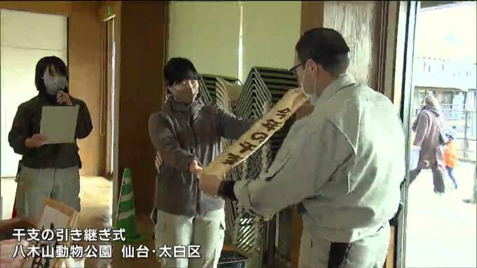 仙台市太白区の八木山動物公園で開かれた干支の引継ぎ式では去年の干支・トラを担当する飼育員から今年の干支・ウサギの飼育員にたすきが受け渡されました。