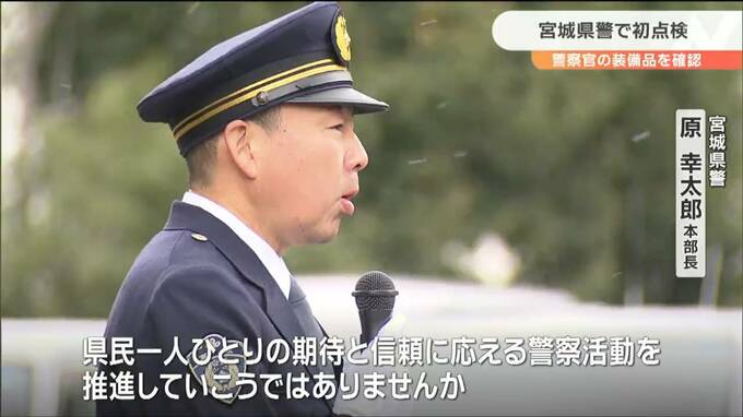 仙台市青葉区の県警本部で行われた「初点検」には警察官80人あまりが参加しました。初点検では警察手帳や警棒、拳銃などに不備がないかを確認しました。その後、原幸太郎本部長が訓示しました。